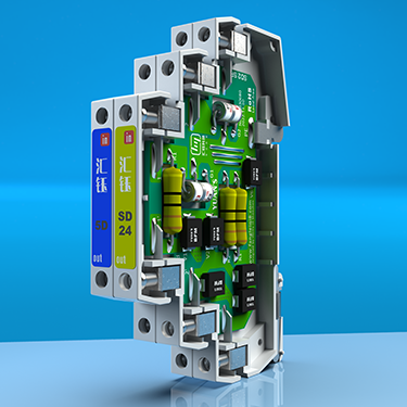 SD系列產(chǎn)品被設(shè)計(jì)為緊湊型的浪涌保護(hù)器,寬度僅為7.1 mm。不同型號(hào)的電涌保護(hù)器可用于保護(hù)具有公共參考電位兩線制(非平衡)接口或浮地(平衡)接口。具有高截止頻率(HF)產(chǎn)品可用于高速傳輸數(shù)據(jù)的平衡總線接口(如Profibus,RS485)。